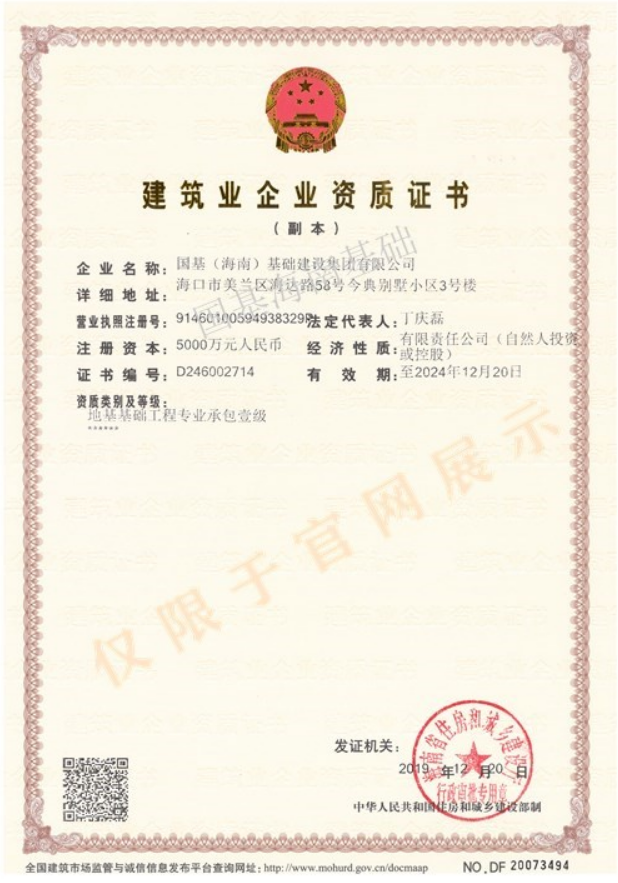 2019年12月20日,海南省住房和城鄉(xiāng)建設(shè)廳正式公布核準(zhǔn)我公司地基基礎(chǔ)工程專業(yè)承包壹級資質(zhì),此次資質(zhì)的成功升級是我公司資質(zhì)建設(shè)的又一個里程碑。 資質(zhì)升級成功后,公司在地基基礎(chǔ)領(lǐng)域?qū)⒂瓉砀鼜V闊的發(fā)展空間,也標(biāo)志著我公司在建筑行業(yè)中將具備更高的水準(zhǔn)。